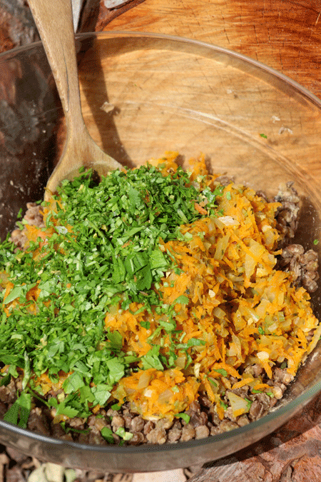 3.En un bol mezclar las lentejas machacadas previamente con las manos, las verduras y añadir el orégano, la albahaca el pimentón y el perejil picado. Mezclar bien todos los ingredientes y ajustar el sabor con sal y pimienta negra.