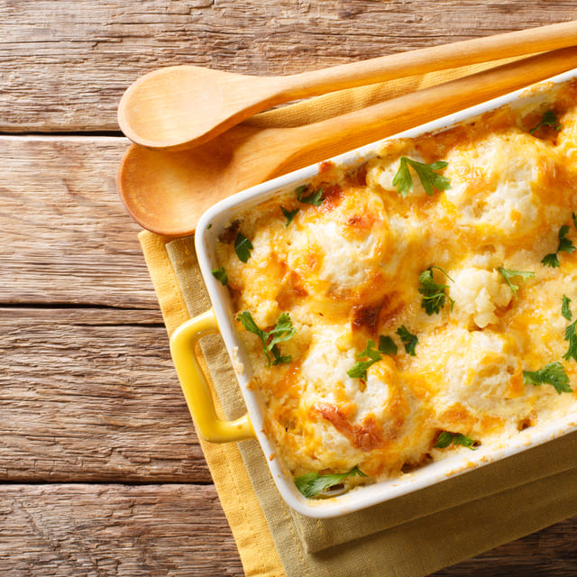 Mezclar la coliflor horneada con la mitad de la salsa. Colocar la mezcla en un recipiente apto para horno, y cubrir con el resto de la salsa.