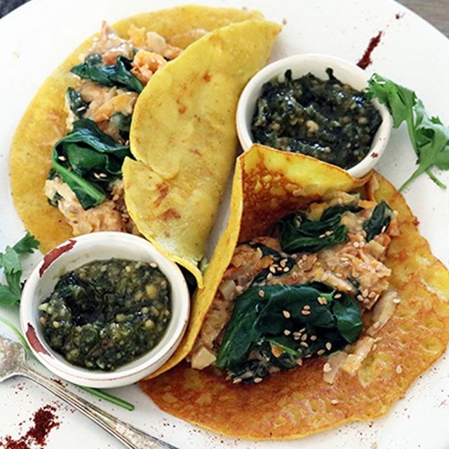 Como ves, no tardan nada en hacerse y además de ser una cena con la que te vas a chupar cada dedo de la mano, estos crepes están hechos sin gluten y son bastante ricos en proteína (por la proteína del garbanzo).