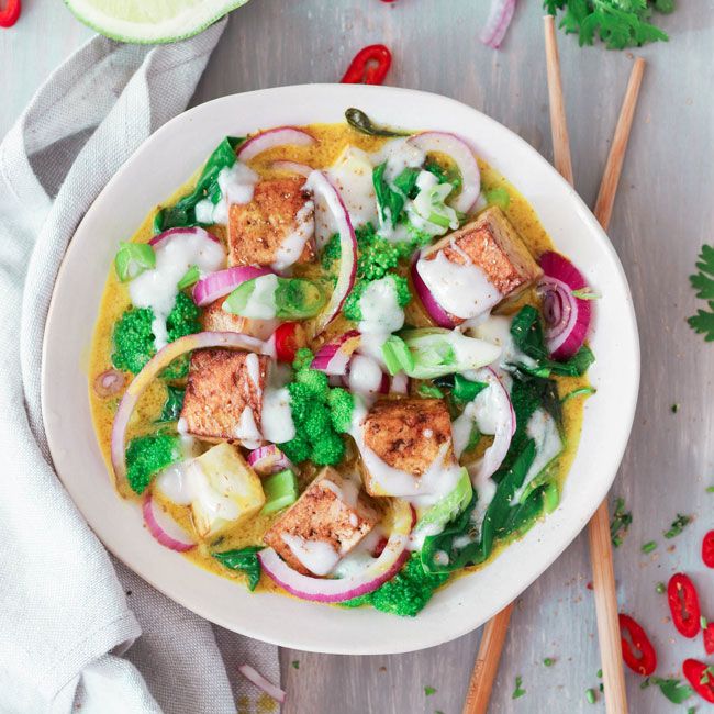 - Incorporar la leche de coco, el tofu, llevar a ebullición y hervir a fuego lento, tapado durante unos 10 minutos más hasta que las verduras estén tiernas. Por último, añadir las hojas de albahaca (sin cortar) y el brócoli cortado a flores y hervir durante 5 minutos.