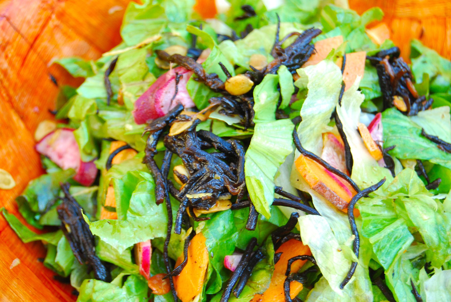 2. Cortar la lechuga en tiras, rallar la zanahoria y mezclar en un bol los rabanitos, la zanahoria, la lechuga, el alga hizki y las semillas de calabaza tostadas.