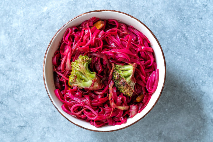 Receta de Espaguetis konjac con pesto de remolacha, tofu y brócoli
