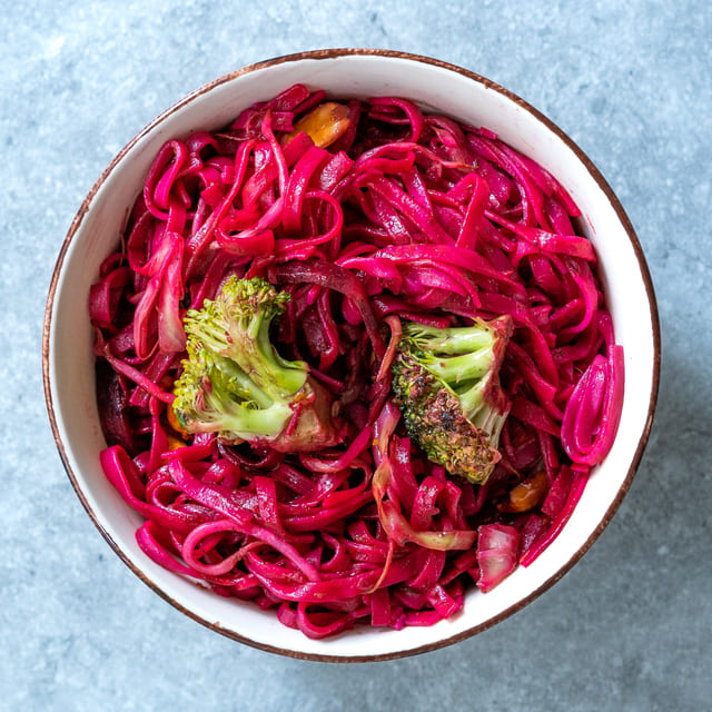 Receta de Espaguetis konjac con pesto de remolacha, tofu y brócoli