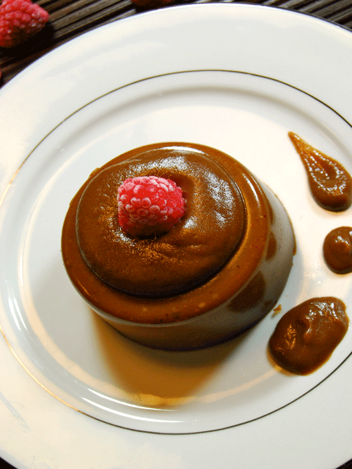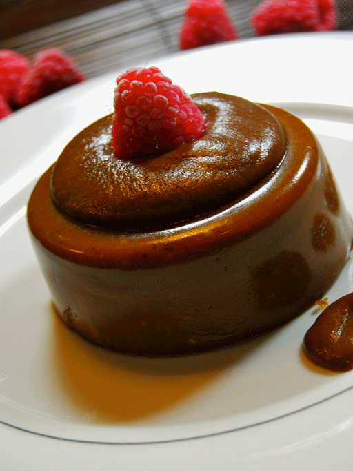 5. Pasado este tiempo las volcamos sobre un plato dándoles la vuelta. Podemos servir este flan de café de cereales con una salsa de algarroba como esta y decorar con unas frambuesas!.