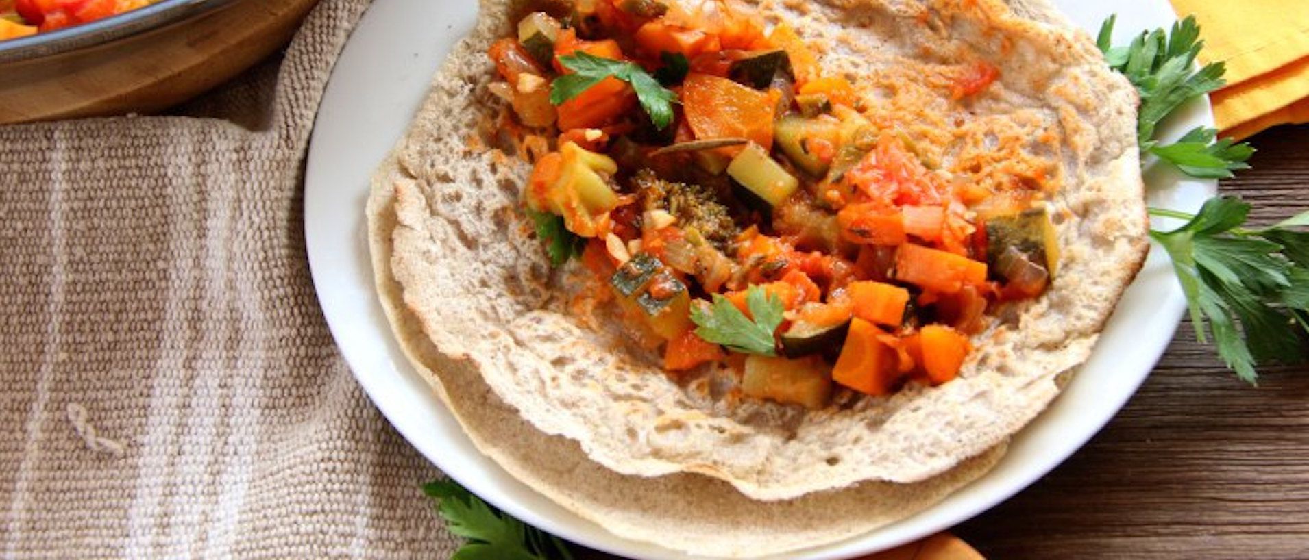 Otros días me encontrarás preparándolos a la hora de comer relleno de un estofado de verduras como el que viene a continuación, sobre todo cuando no me he organizado bien y no he preparado ningún cereal integral para la comida.¡Y otras veces simplemente no se me ocurre mejor cena que un buen crepe vegano y sin gluten relleno de humus para terminar el día!