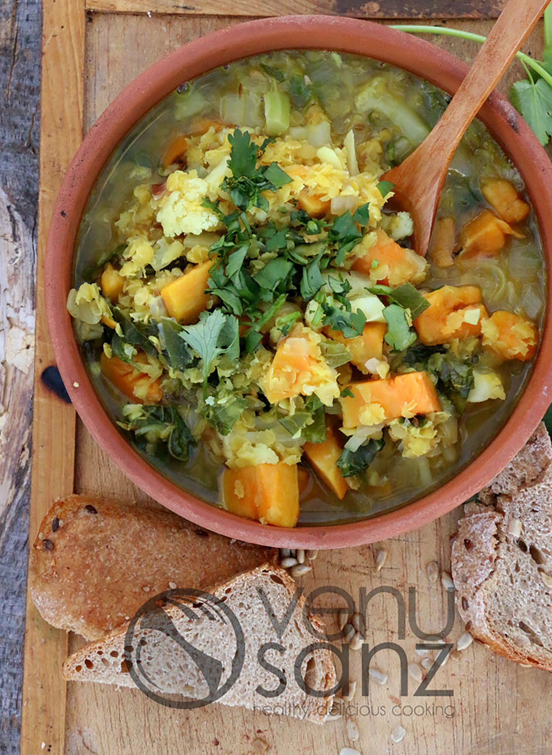 Además, creo que he descubierto otro amor en mi vida: el comino! y tengo que decir que me está costando vivir sin el….las lentejas rojas combinan genial con especias como el comino, por eso en esta ocasión he puesto una mezcla perfecta de especias para calentarnos ahora durante el invierno: el comino, el cilantro en polvo y la cúrcuma son condimentos buenísimos con los que podemos dar un sabor increíble a nuestros platos. Reconozco que me he visto muy tentada a condimentarla con mi amigo el curry, pero he decidido en esta ocasión omitirlo y quedarme con los otros tres :D.