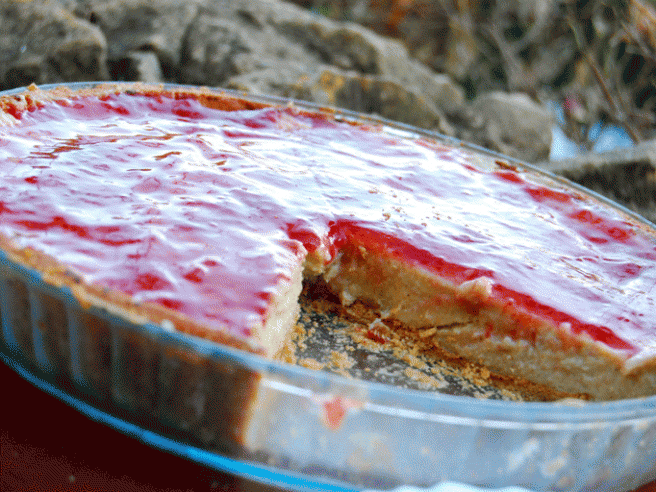Para la base: • Harina de trigo integral: 1 taza • Harina blanca de espelta o de trigo: 1 taza • Sal fina: 1 c.p • Dátiles: 1 taza (unos 17 dátiles de tamaño normal) • Aceite de girasol: 5 c.s • Canela: 1 c.p • Agua fría: 140 ml Para el relleno: • Mijo: 3/4 de taza remojado en 2 1/2 tazas de agua • Sal: una pizca • Anacardos: 3/4 de taza remojados durante la noche • Zumo de limón: 1/2 taza • Ralladura de limón: 2 c.p • Sirope de arroz: 150 ml • Vainilla en polvo: 2 c.p Para el sirope de fresa: • Mermelada de fresa o frambuesa sin azúcar y sin edulcorantes: 1 tazaCÓMO HACER UNA TARTA DE QUESO SIN QUESO: