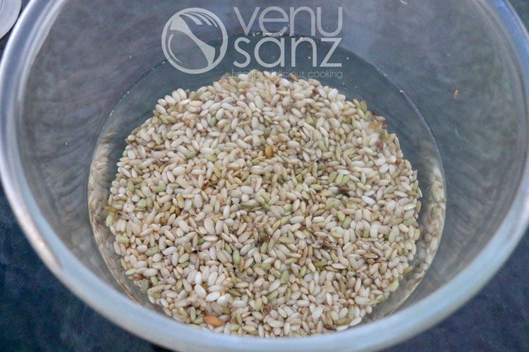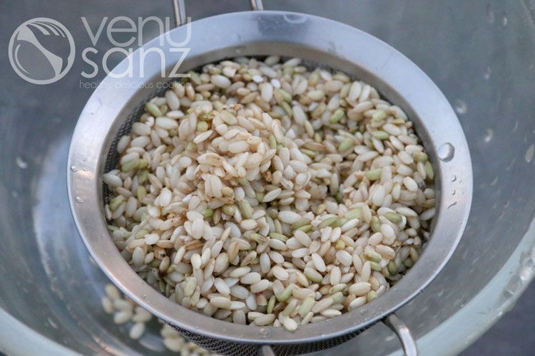 1. Disponemos el arroz integral en un bol y lo lavamos bien con agua del grifo removiendo el agua con las manos. Repetimos este proceso unas 3 veces hasta que el agua salga totalmente clara. Escurrimos bien el arroz y lo remojamos en agua durante al menos 6 horas. (Yo hago este proceso por la mañana cuando me levanto)